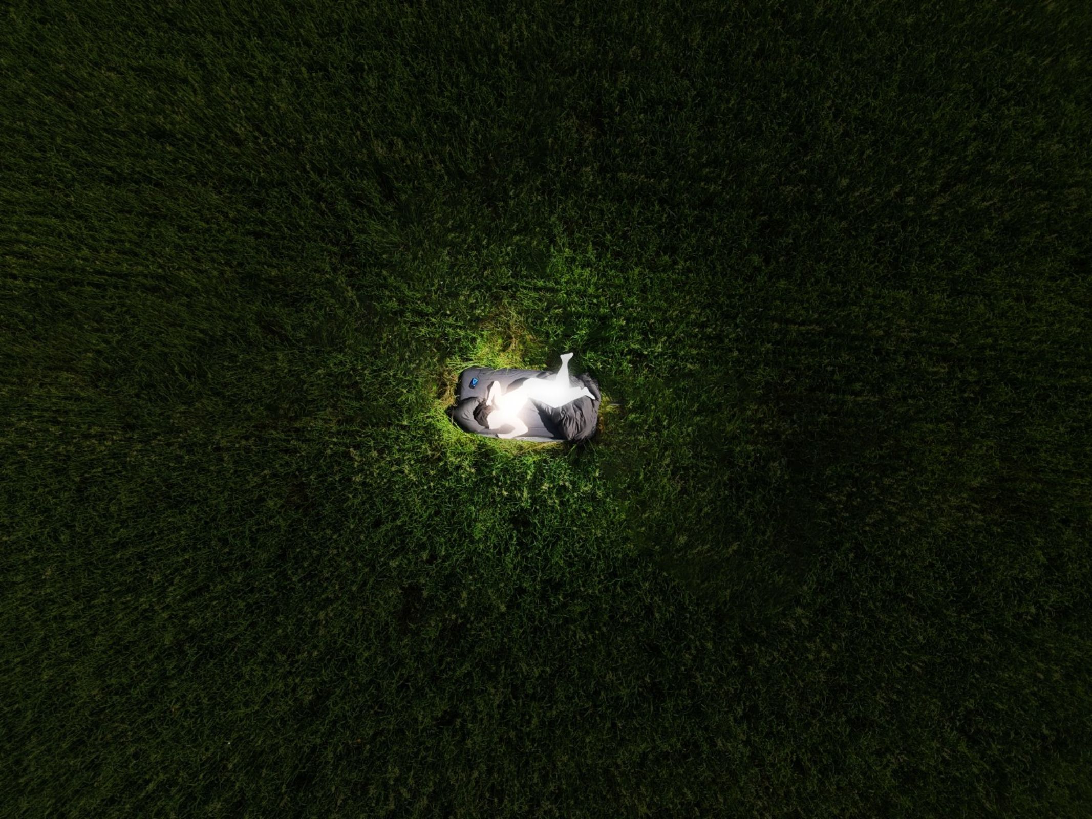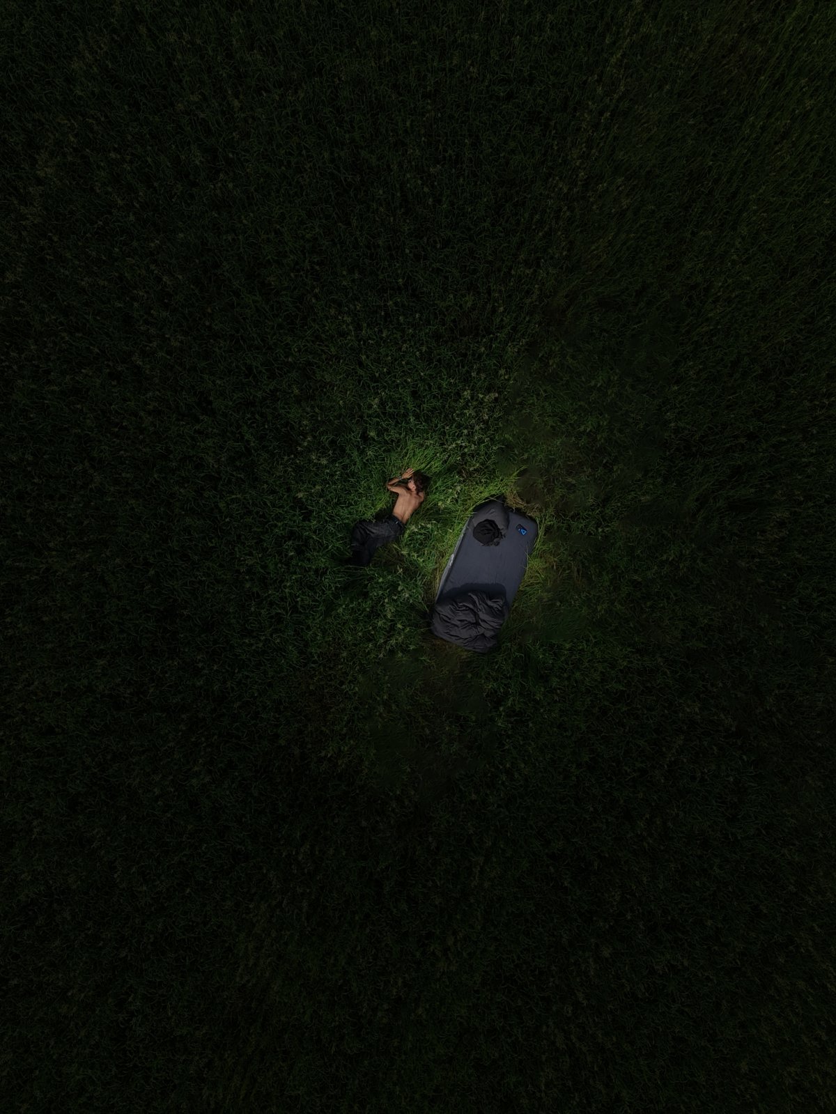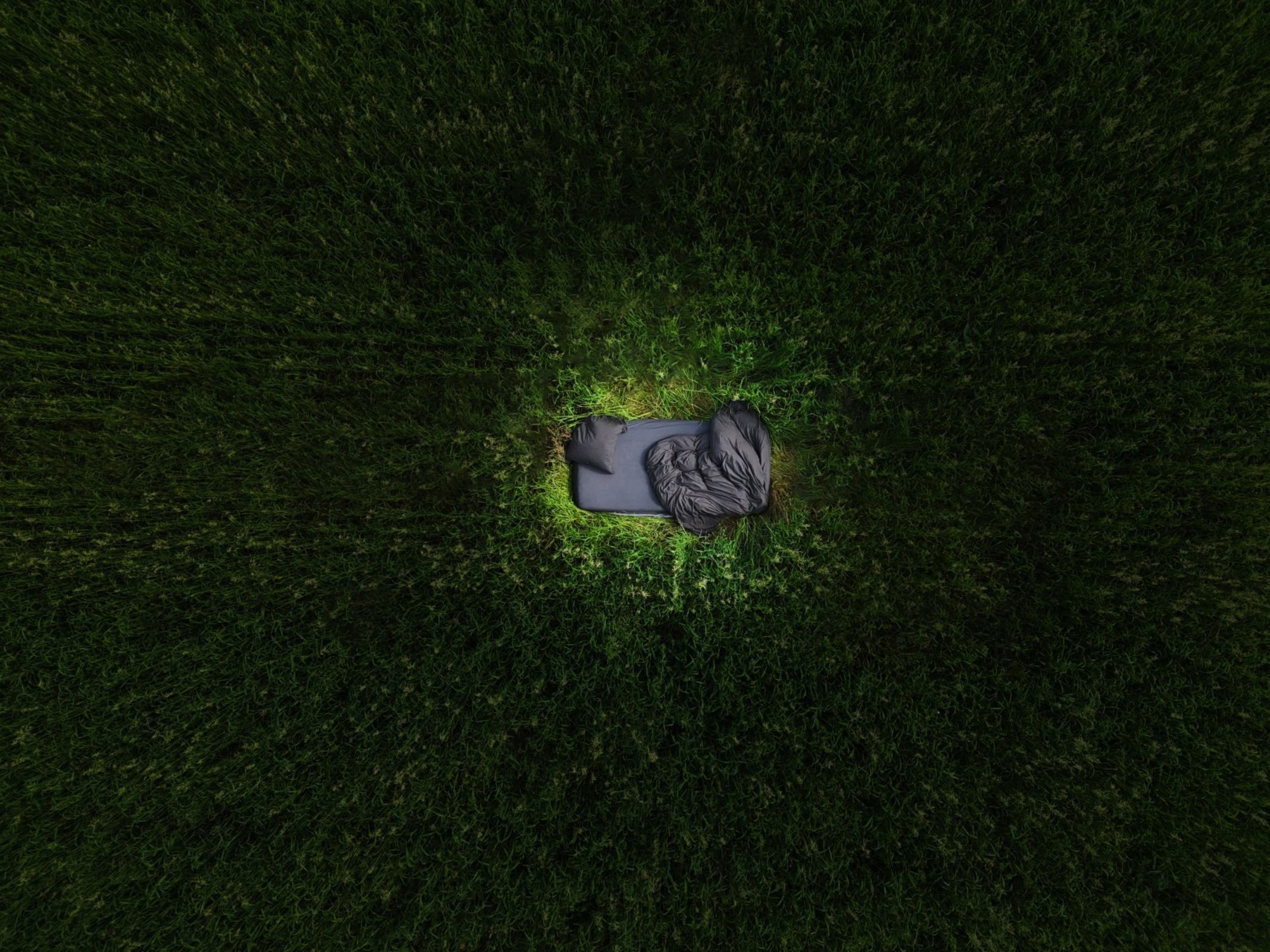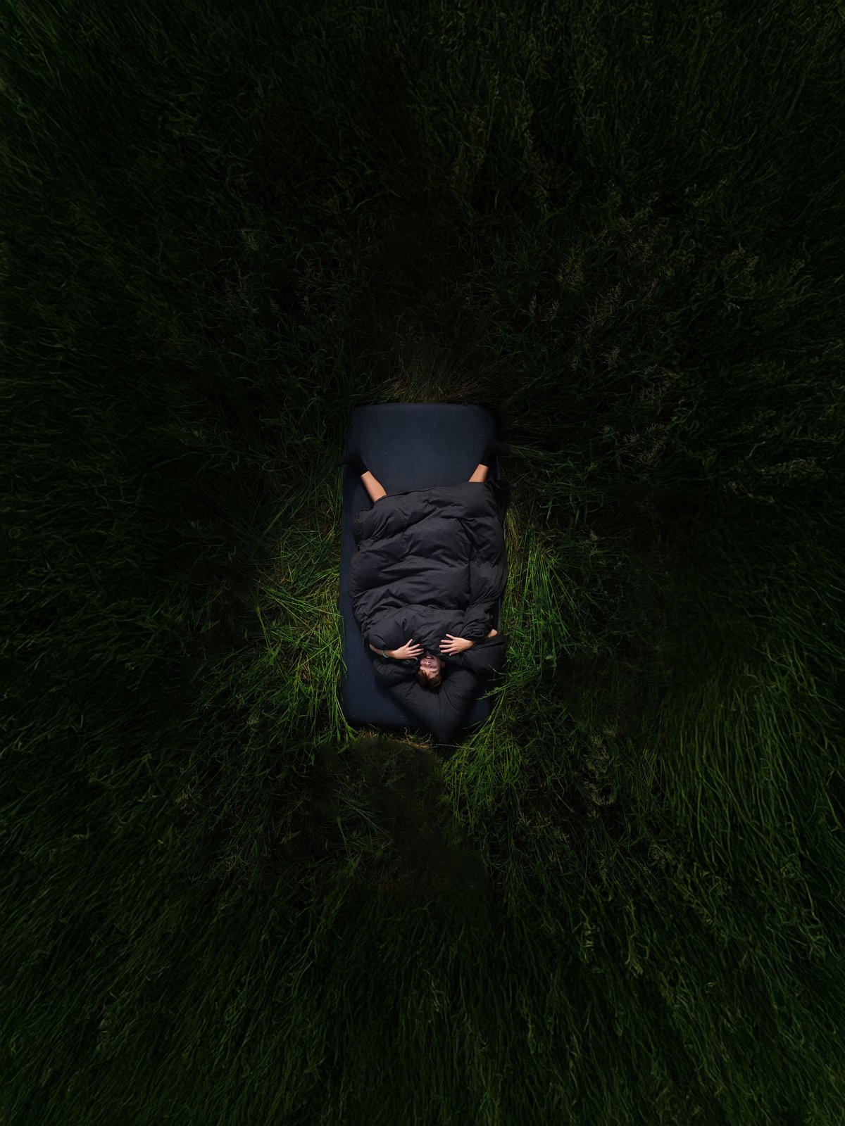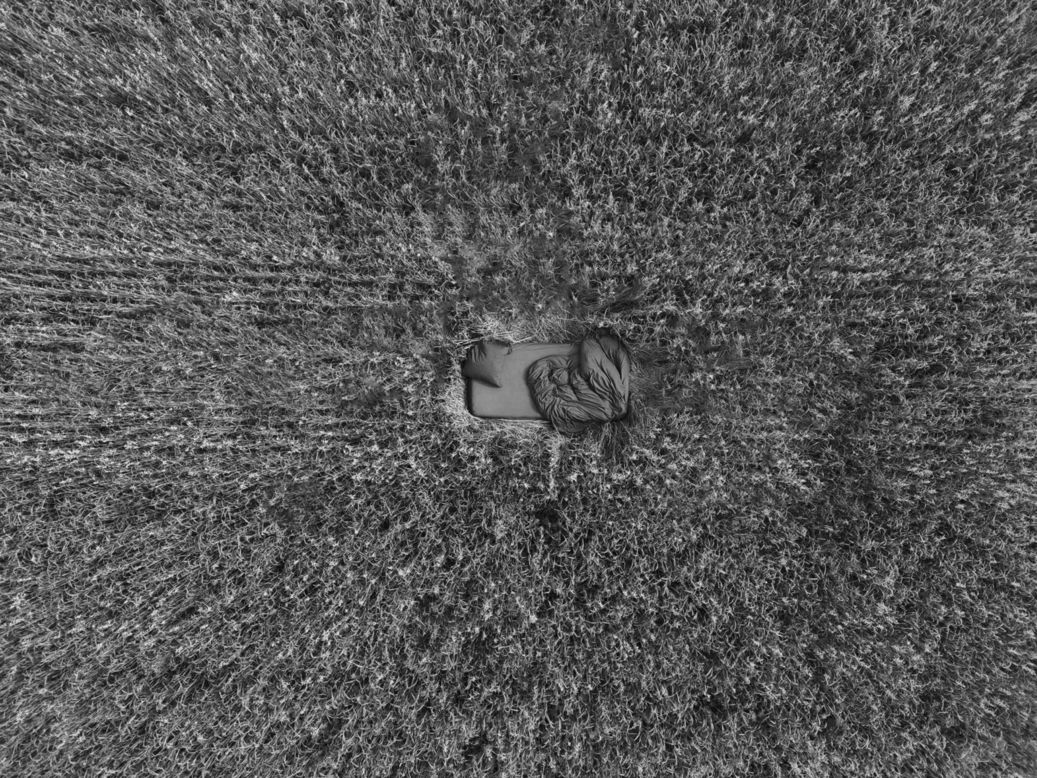 J’ai installé un lit au milieu d’un champ et pris des photos dans le noir. Avec le drone, les vues d’en haut créaient une ambiance de rêve, solitaire et surréaliste, comme si quelqu’un dormait en plein milieu de nulle part.